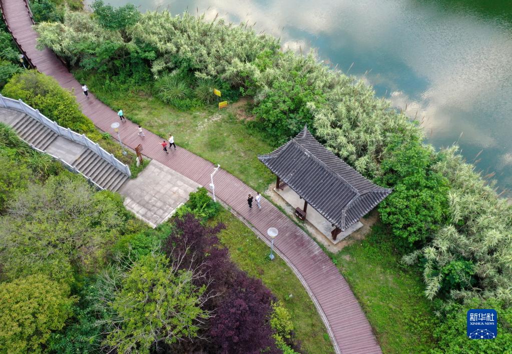 5月27日,人們在貴州省遵義市正安縣北郊湖濕地公園景區游玩(無人機照片)。