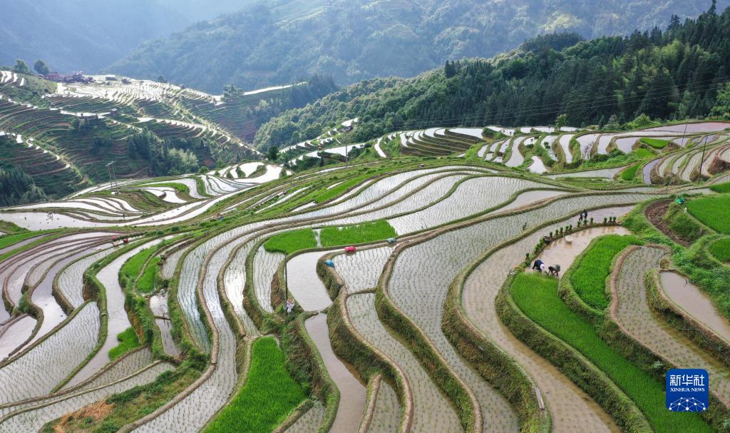 貴州省黔東南苗族侗族自治州從江縣加榜鄉加頁村梯田風光(5月27日攝,無人機照片)。