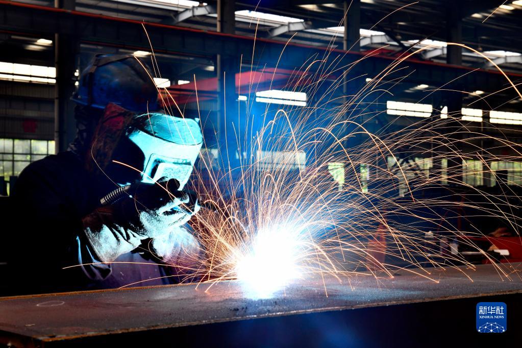 5月28日,在嘉祥縣國家級裝配式建筑產業園,工人在焊接裝配式鋼結構框架。