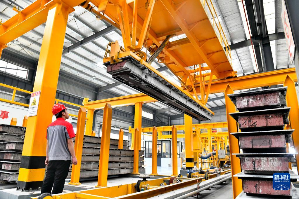5月28日,在嘉祥縣國家級裝配式建筑產業園,工人在生產線上操作機械,加工裝配式建材混凝土砌塊。
