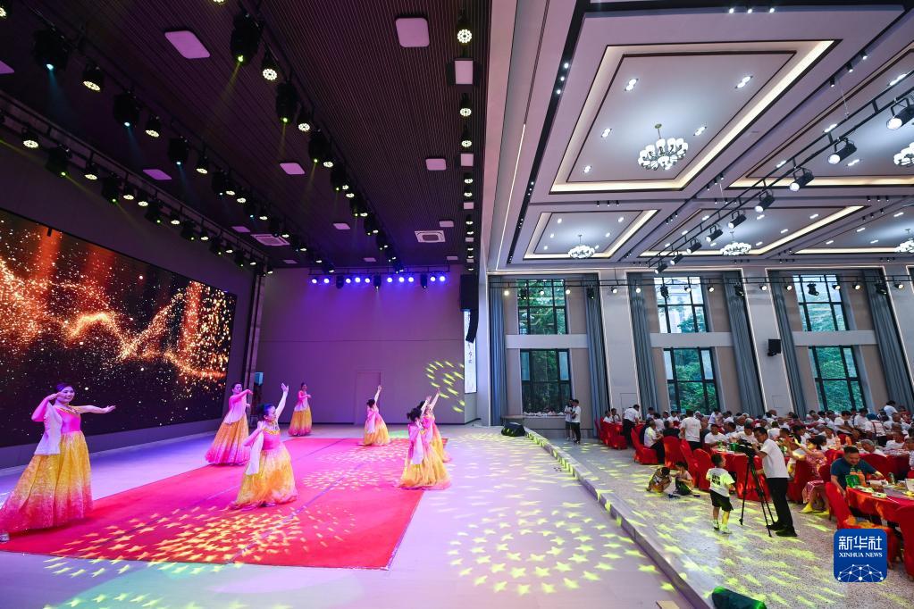 5月27日,梅坪村的村民在新建成的文化中心內的村文化禮堂參加百家宴并觀看文藝演出。