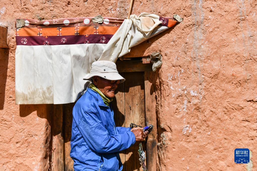 仁增旺扎老人打開其中一間還留存有壁畫的石窟大門(5月26日攝)。