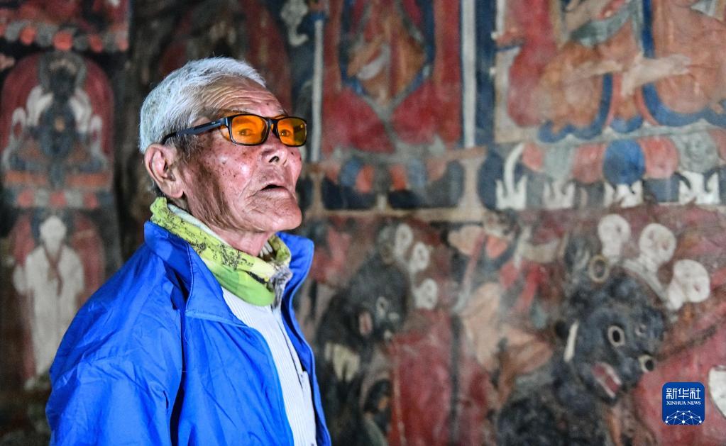 仁增旺扎老人查看壁畫(5月26日攝)。