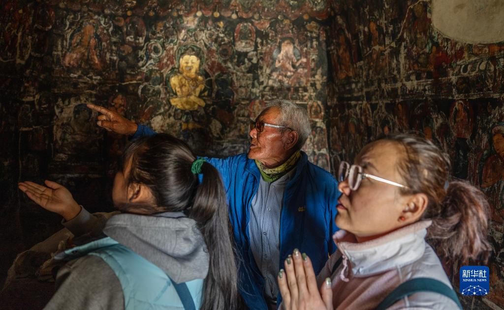 5月26日,仁增旺扎老人(中)在為游客介紹壁畫。