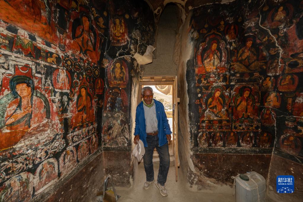 5月26日,仁增旺扎老人走進繪滿壁畫的石窟。