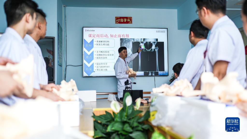 貴州省人民醫院骨科主任醫師通過3D打印模型向規培醫生講解髖關節疾病患者的治療案例(5月25日攝)。