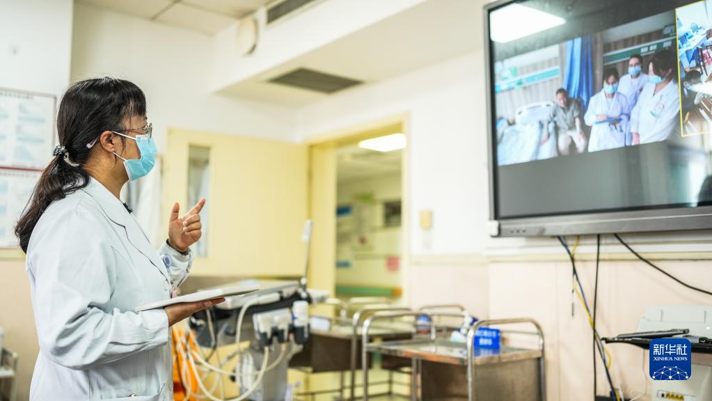貴州省人民醫院呼吸科主任醫師通過5G+遠程醫療平臺對龍里縣人民醫院的患者給出治療建議(5月25日攝)。