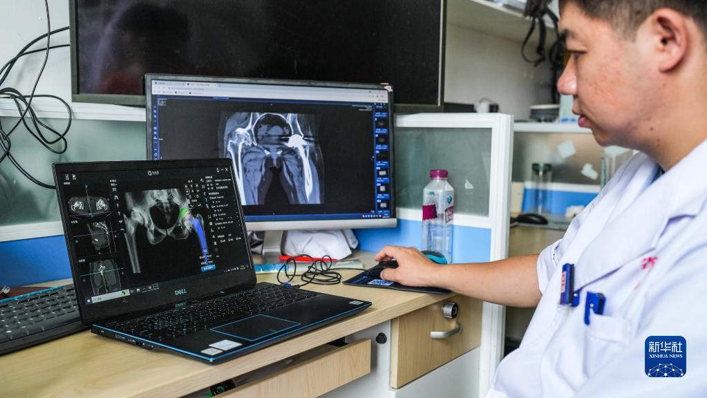 貴州省人民醫院骨科醫生通過AI軟件進行髖關節置換手術的術前規劃(5月25日攝)。