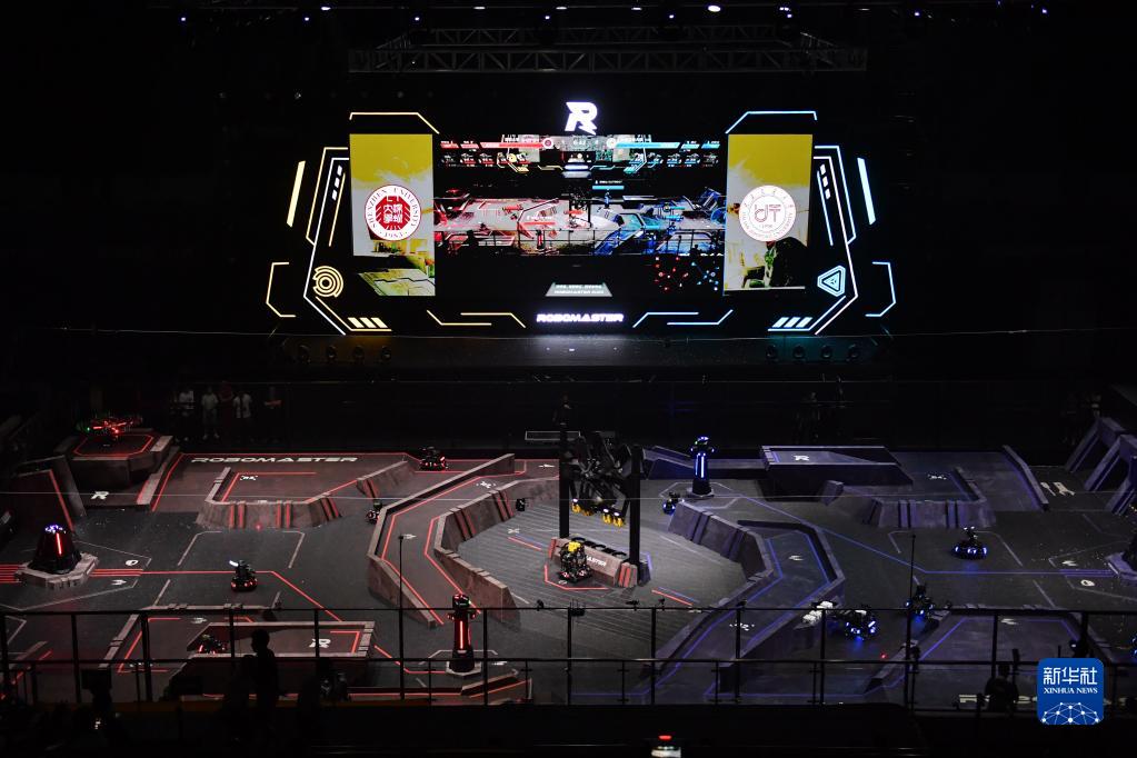 5月28日,大連交通大學TOE戰隊(藍方)和深圳大學RobotPilots戰隊(紅方)的機器人在比賽中交鋒。