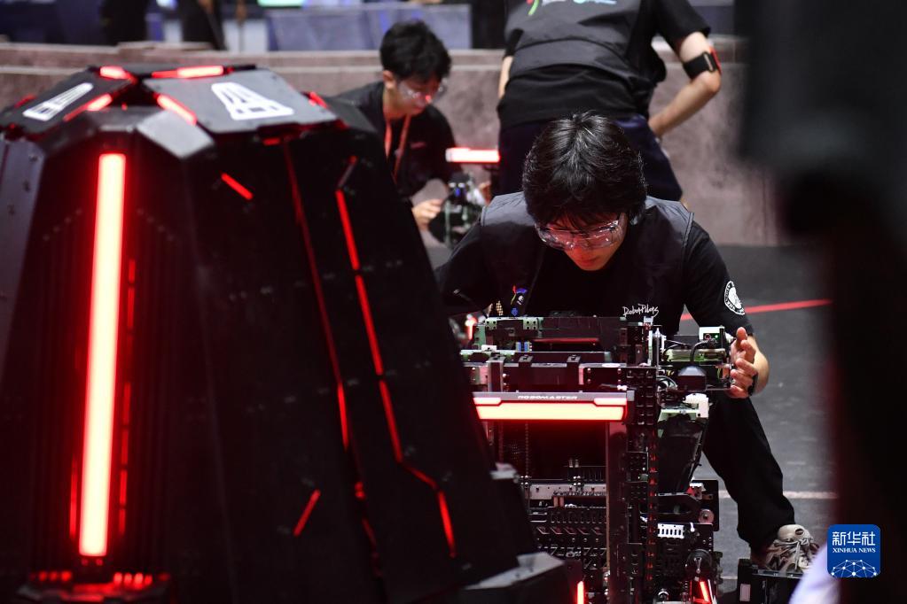 5月28日,深圳大學RobotPilots戰隊隊員在比賽間隙調整機器人。