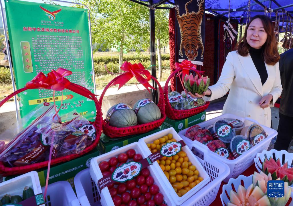 5月28日,珠峰博覽園的工作人員在第十屆白朗果蔬采摘節上展示自產的蔬菜、水果。