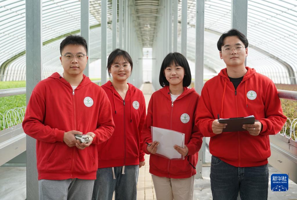 在位于平谷區峪口鎮的京瓦溫室園藝示范園葉菜無土栽培溫室拍攝的西樊各莊科技小院的大學生(5月9日攝)。
