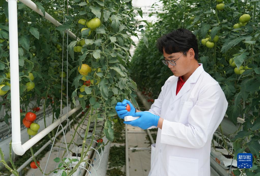 5月28日,在位于平谷區峪口鎮的京瓦溫室園藝示范園,西樊各莊科技小院駐村大學生王萌測量番茄果實的可溶性糖含量。