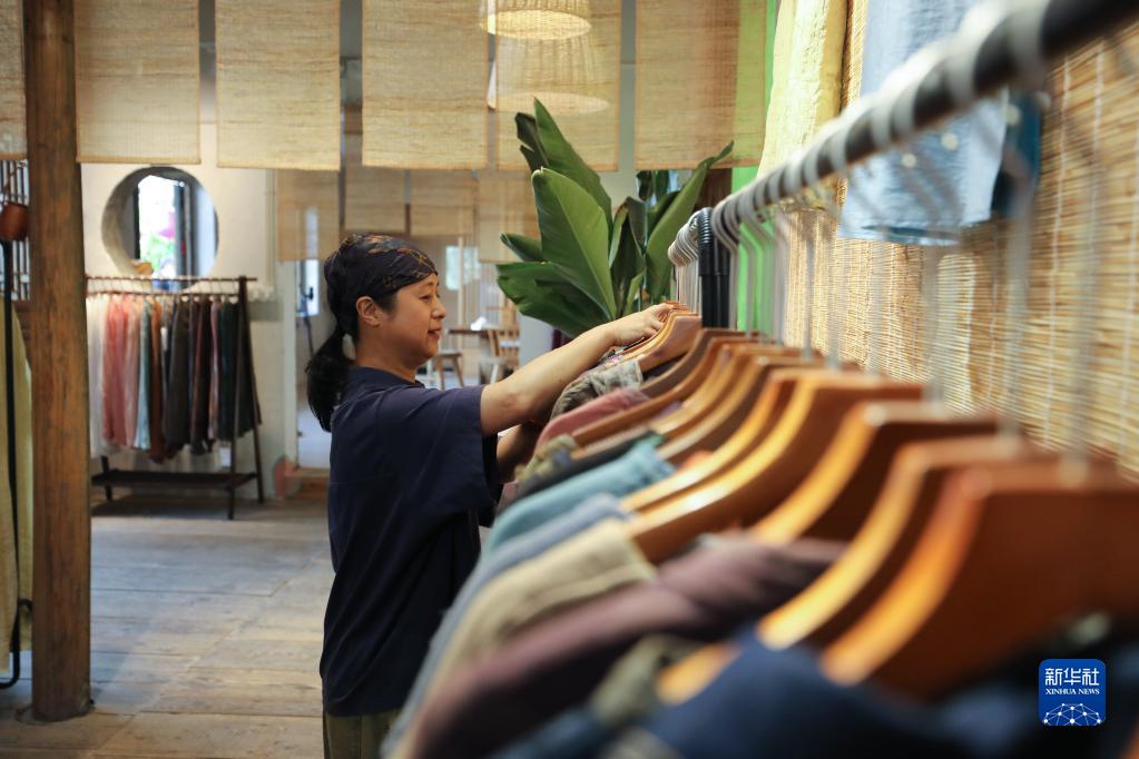 5月23日,在義烏市李祖村,創客鮑麗萍在店鋪里整理服裝產品。新華社記者 杜瀟逸 攝