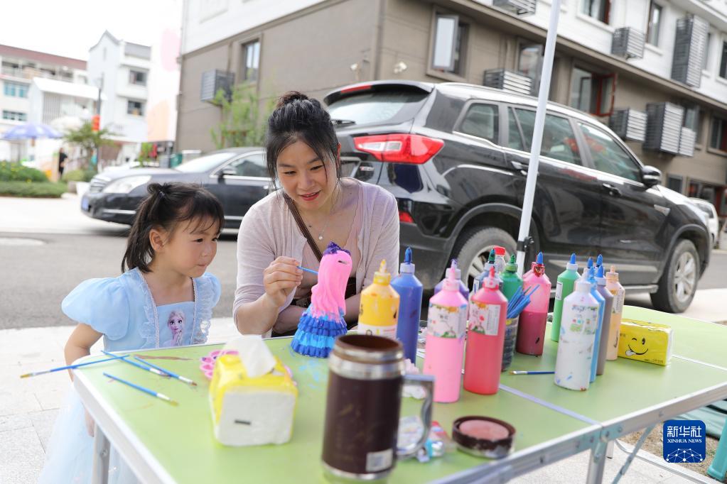 5月27日,在臺州市仙居縣上葉村,游客帶著小朋友在攤位上制作創意手工。新華社記者 杜瀟逸 攝