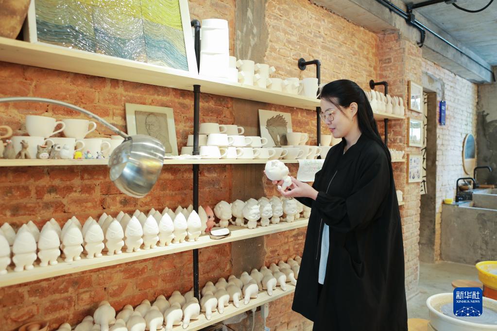 5月24日,在衢州市龍游縣溪口未來鄉村黃泥山片區,創業者吳琴芬在文創工作室內查看作品。新華社記者 鄭衛 攝