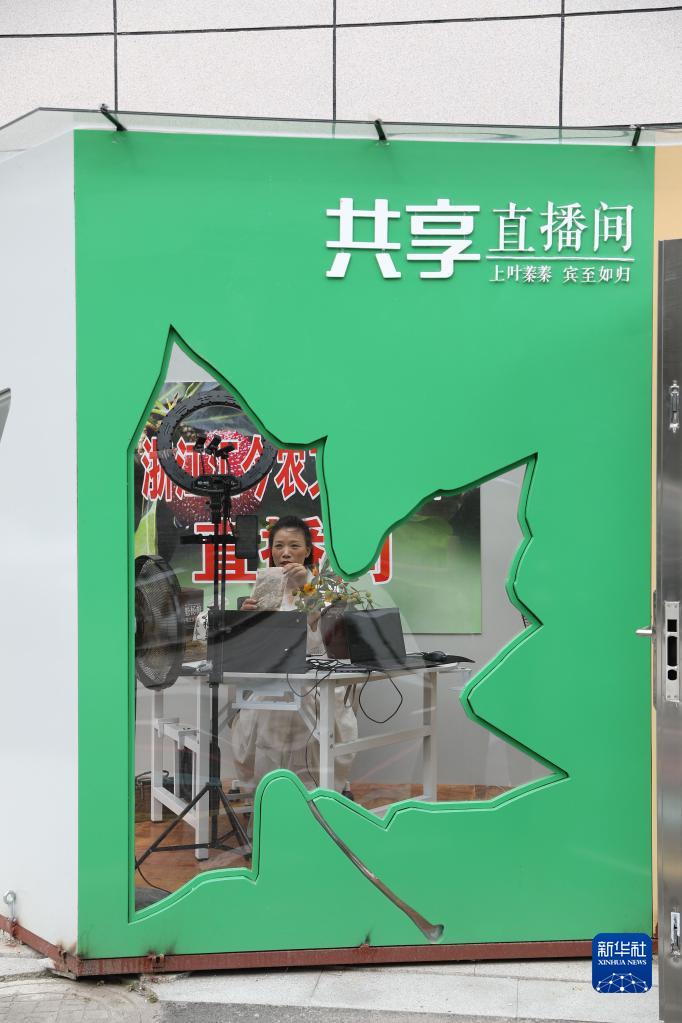 5月27日,在臺州市仙居縣上葉村,網絡主播在街頭的共享直播間直播銷售產品。新華社記者 杜瀟逸 攝