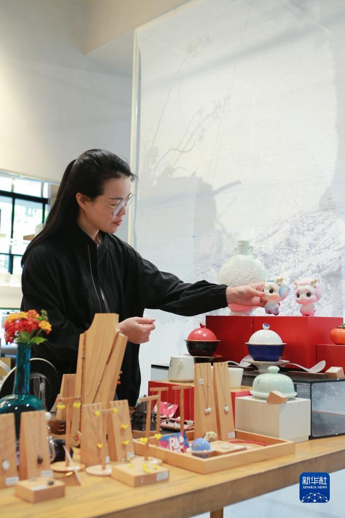 5月24日,在衢州市龍游縣溪口未來鄉村黃泥山片區,創業者吳琴芬在文創工作室內整理商品。新華社記者 鄭衛 攝