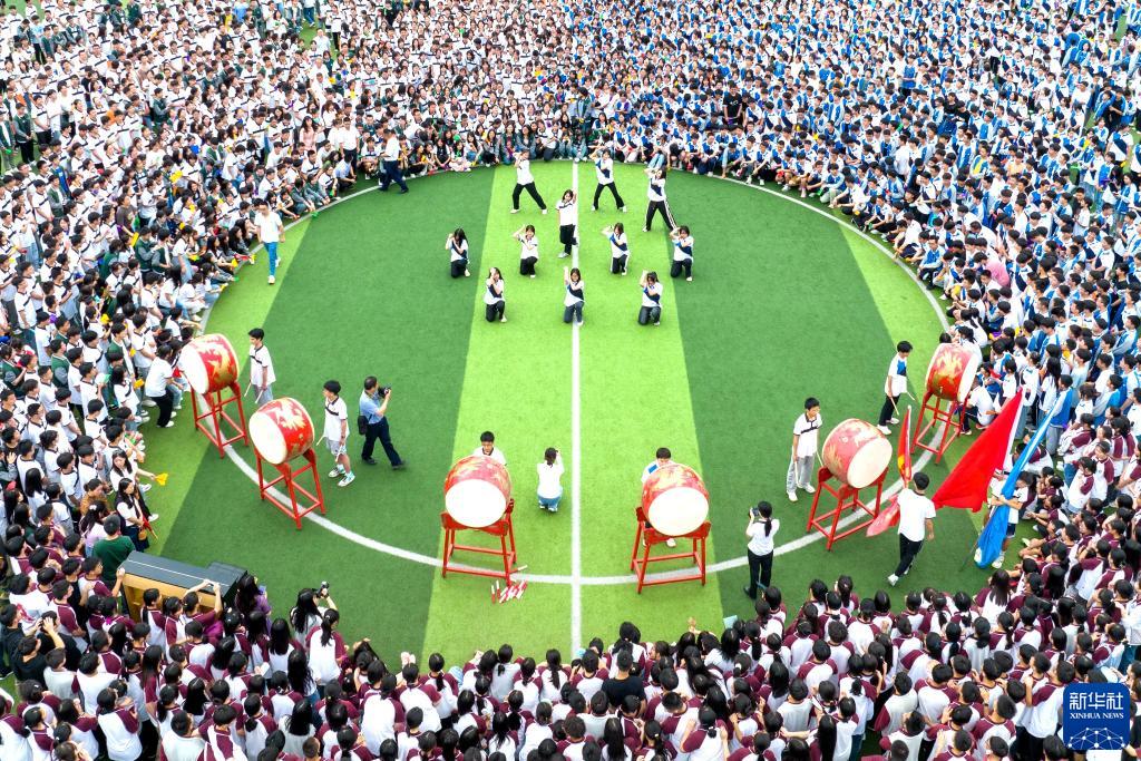 5月29日,湖北省宣恩縣第一高級中學學生在快閃活動中表演鼓舞(無人機照片)。