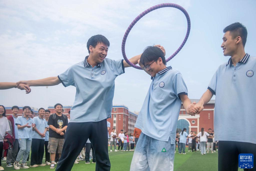 5月25日,在湖南省永州市道縣道州玉潭(東陽)學校,高三學生在操場上做減壓趣味活動。