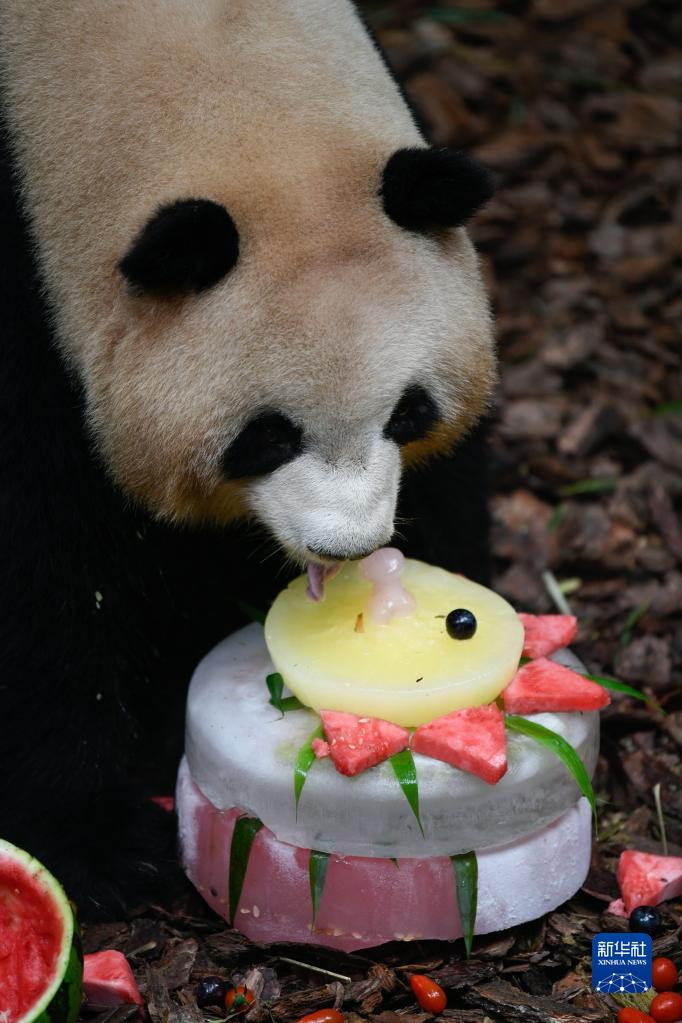 5月29日,在成都大熊貓繁育研究基地都江堰野放繁育研究中心,梅蘭在品嘗飼養員為它準備的冰蛋糕。