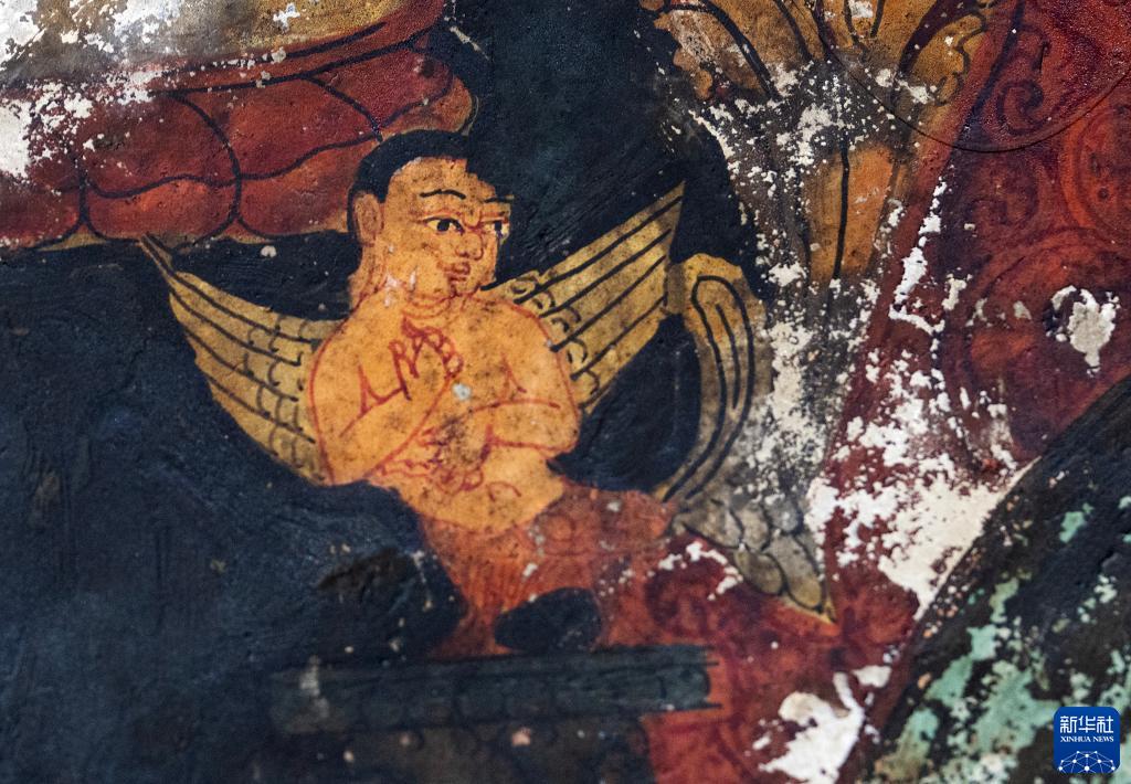這是5月26日拍攝的皮央石窟壁畫中的長翅膀的人物造型。