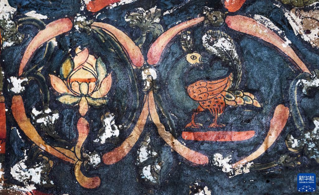 這是5月26日拍攝的皮央石窟壁畫中的孔雀像。