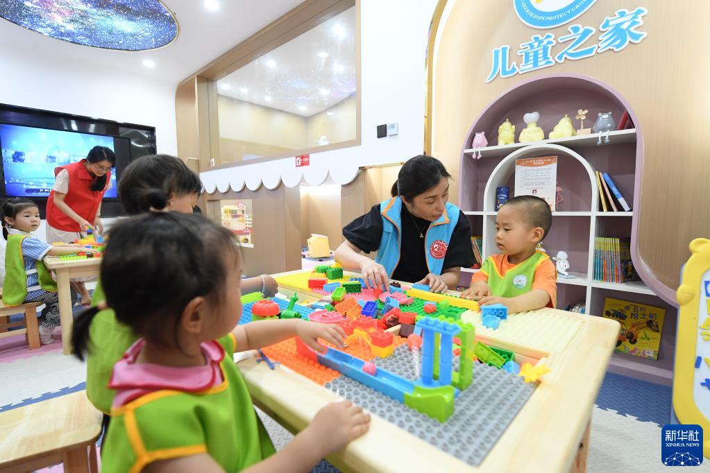 5月29日,在愛山街道利民社區,一個公益組織的老師帶著兒童玩積木。