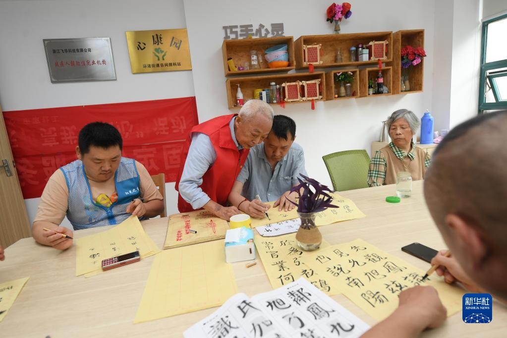 5月29日,在湖州市環渚街道玉堂橋社區,凌法林(左二)指導殘障人士練習書法。