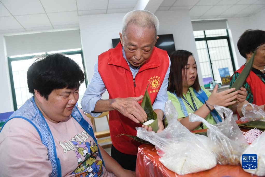 5月29日,在湖州市環渚街道玉堂橋社區組織的迎端午活動中,凌法林(左二)和其他志愿者一起指導殘障人士包粽子。