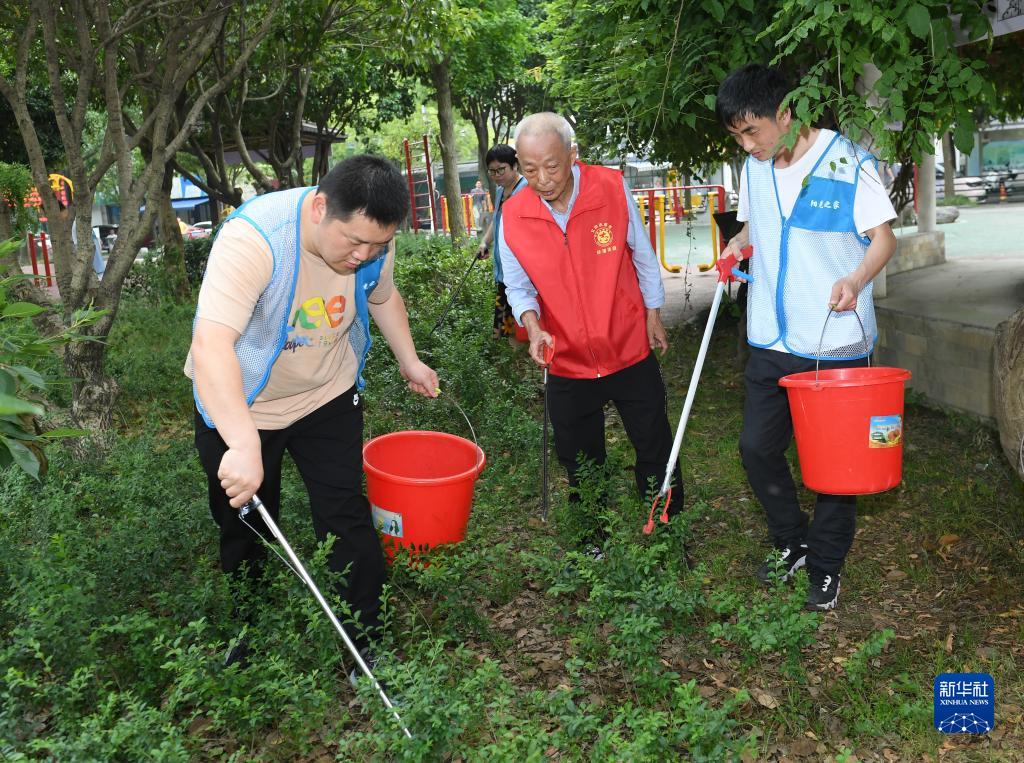 5月29日,在湖州市環渚街道玉堂橋社區,凌法林(中)帶領殘障人士參與到社區日常保潔工作中。