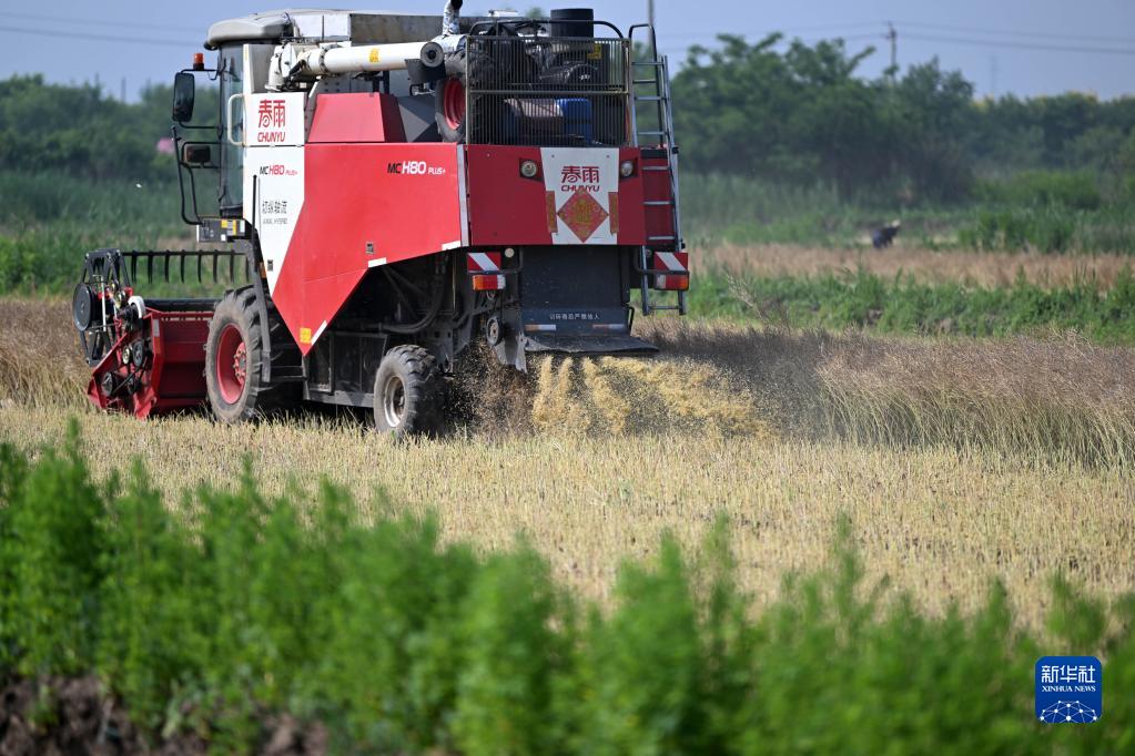 5月29日,聯合收割機在油菜田里收割菜籽。
