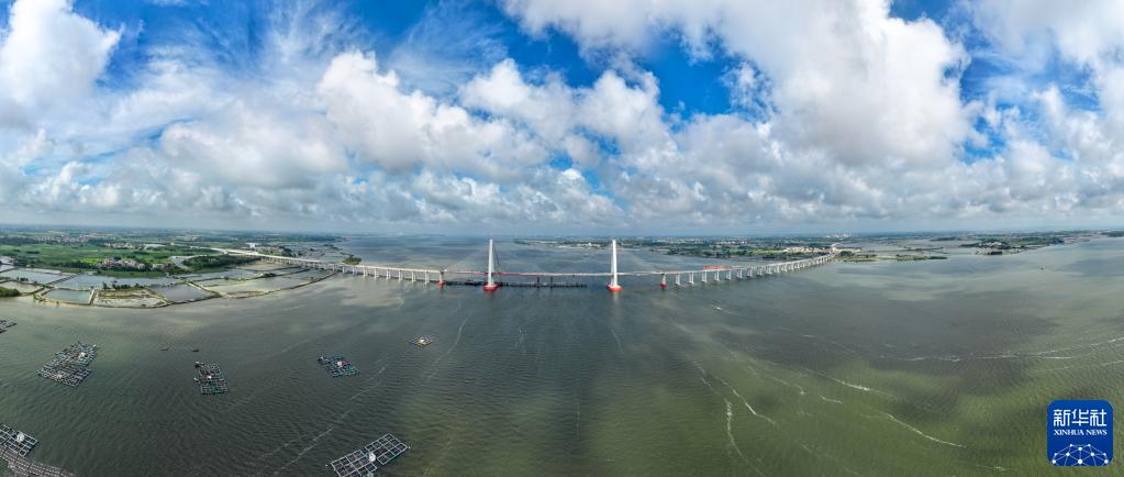建設中的湛江鷺洲大橋(5月25日攝,無人機全景照片)。中鐵大橋局承建的鷺洲大橋橫跨南三島,建成通車后,當地居民出入島時長將由45分鐘縮短至15分鐘,為南三島海島旅游發展奠定交通基礎。