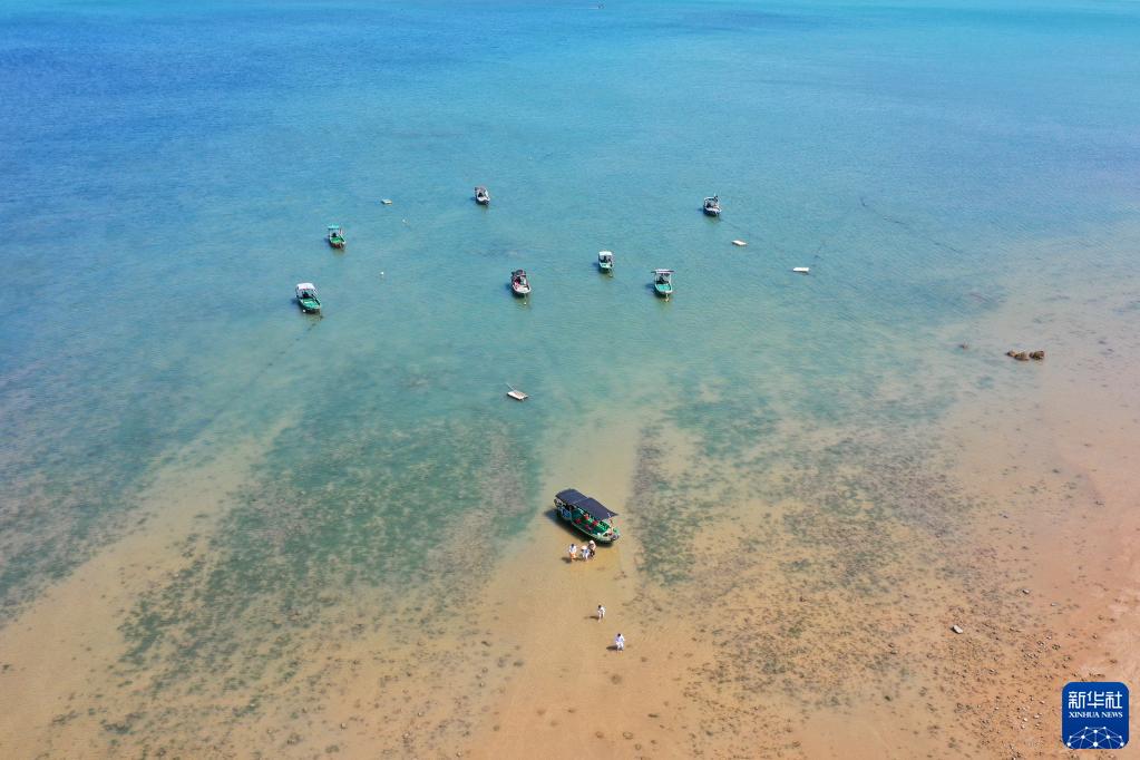 5月28日,游客在中國大陸最南端的“南極村”趕海(無人機照片)。