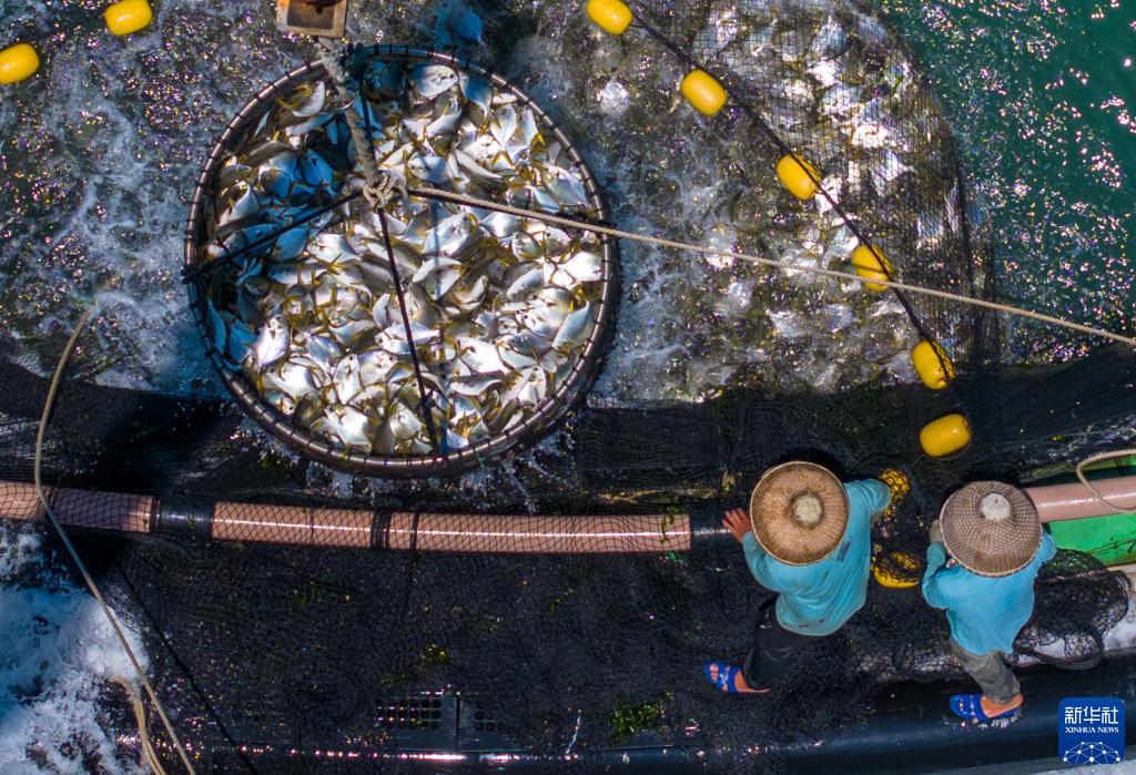 在湛江徐聞西連鎮,漁業工人從深海網箱中打撈金鯧魚(5月27日攝,無人機照片)。廣東省湛江市是全國最大的金鯧魚養殖基地之一,被譽為“中國金鯧魚之都”。