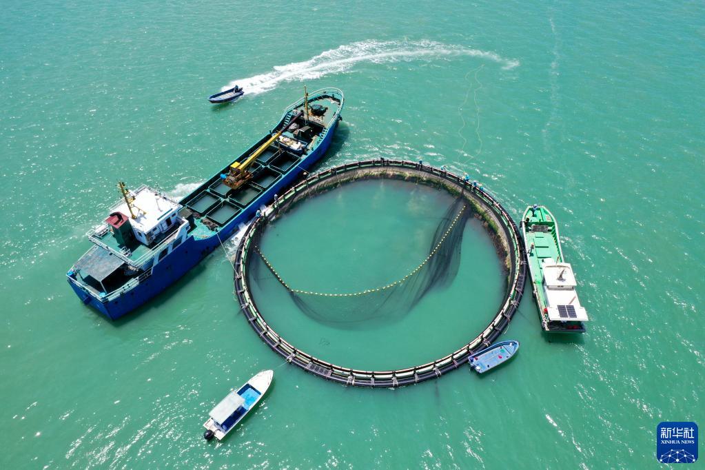 5月27日,在湛江市徐聞縣西連鎮,漁業工人在深海網箱拉網收獲金鯧魚(無人機照片)。