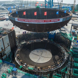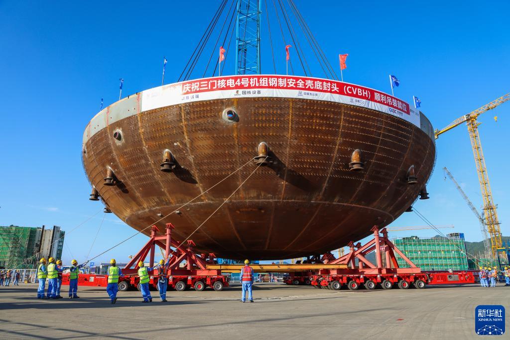 5月29日,在浙江省臺州市三門縣,三門核電二期工程4號機組核島鋼制安全殼底封頭順利吊裝就位。這是4號機組核島反應堆廠房吊裝的首個大型模塊,標志著該廠房主體結構施工開始。三門核電二期工程4號機組于3月22日開工,整個二期工程建成投產后,一、二期裝機總容量將達到500萬千瓦,年發電量預計可達到400億千瓦時。