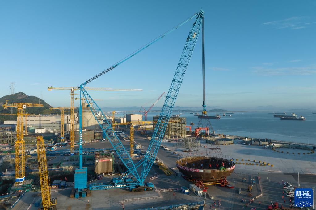 這是5月29日拍攝的三門核電二期工程4號機組核島鋼制安全殼底封頭吊裝現場(無人機照片)。