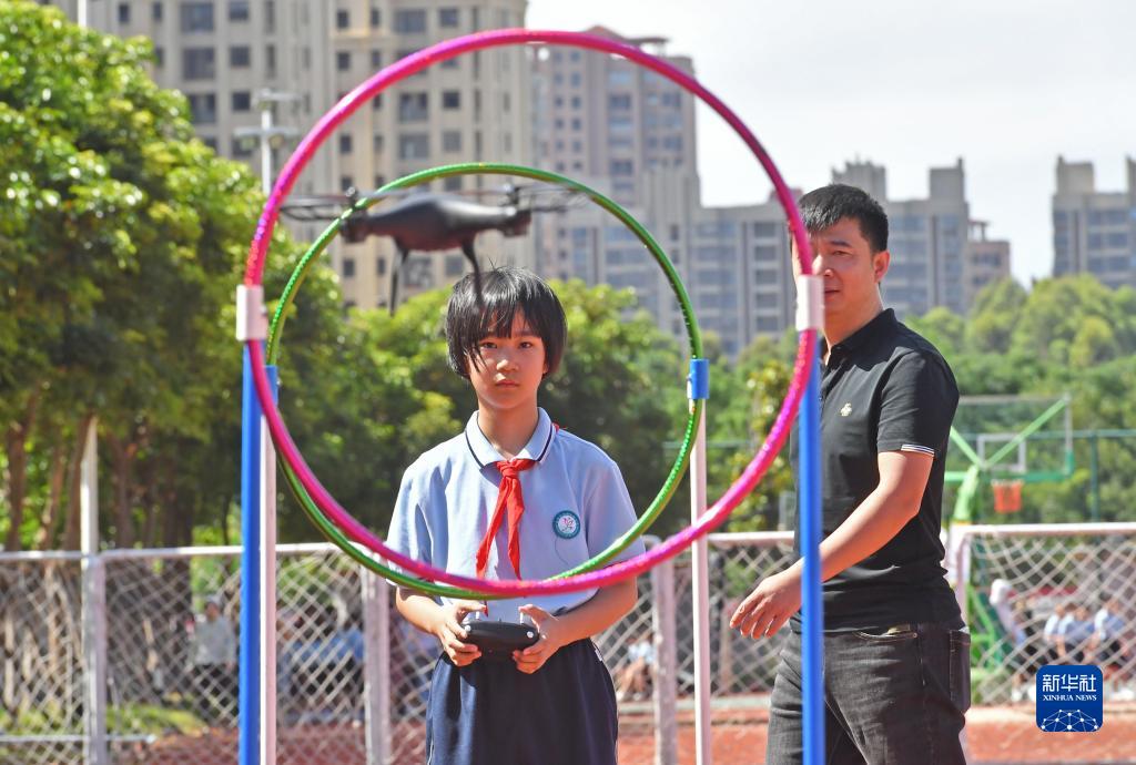 5月29日,在福建省泉州市泉港區益海實驗小學“六一”青少年宮展演現場,一名學生在表演無人機穿越障礙。