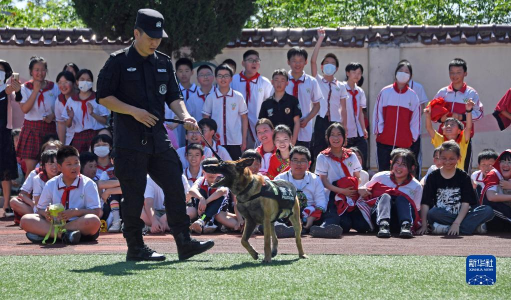 5月29日,在浙江省臺州市仙居縣第五小學舉行的“警營開放迎六一”活動上,民警為學生們展示警犬協同演練。