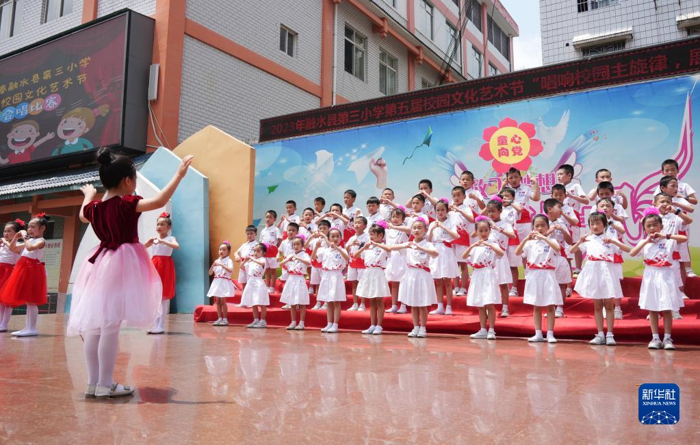 5月29日,廣西柳州市融水苗族自治縣第三小學學生在“慶六一”文化藝術節合唱比賽上演唱歌曲。