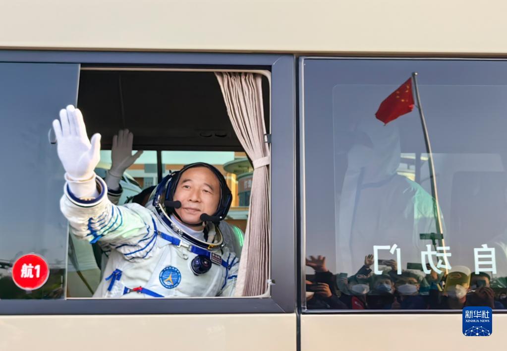 5月30日6時42分,神舟十六號載人飛行任務航天員乘組出征儀式在酒泉衛星發射中心問天閣圓夢園廣場舉行。這是航天員景海鵬在出征儀式上。
