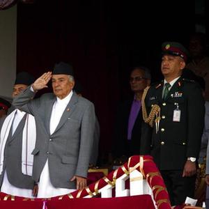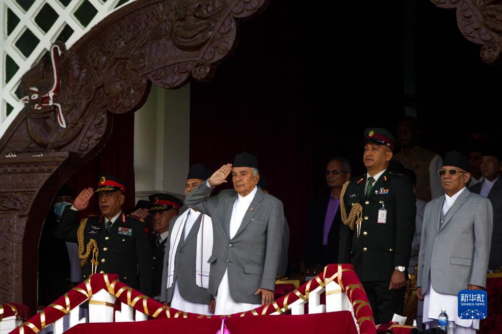 5月29日,尼泊爾總統拉姆·昌德拉·鮑德爾(中)在加德滿都出席共和日慶?;顒?。