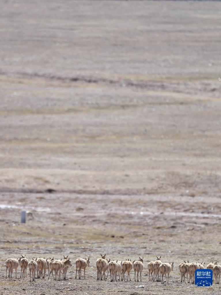 5月29日,在青??煽晌骼?,一群雌性待產藏羚羊準備通過青藏公路。