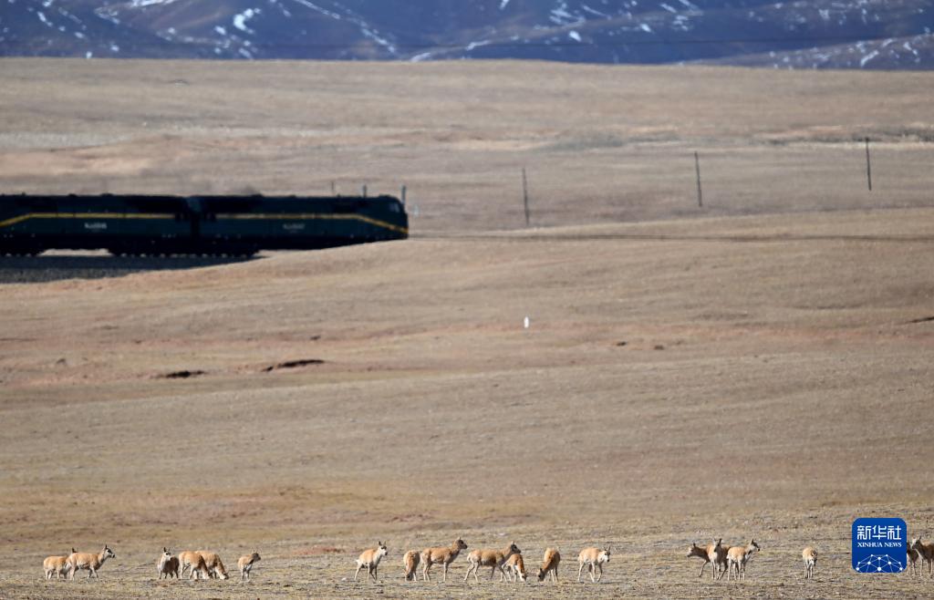 5月29日,一群藏羚羊在青海省玉樹藏族自治州境內的草原上活動,一列火車行駛在它們身后的青藏鐵路上。