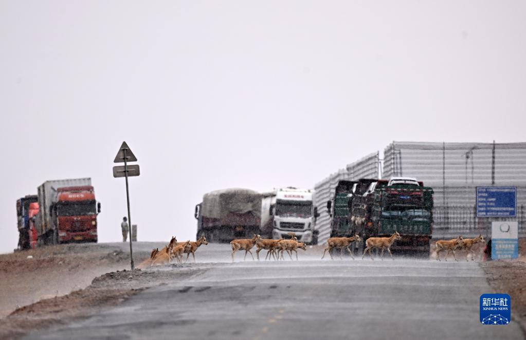 在青??煽晌骼?,一群雌性待產藏羚羊在雪中通過青藏公路(5月25日攝)。