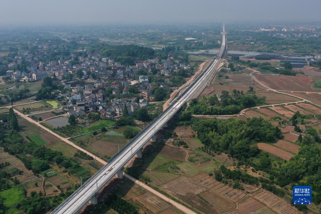 5月30日在浙江省龍游縣境內拍攝的杭衢鐵路無砟軌道施工現場(無人機照片)。