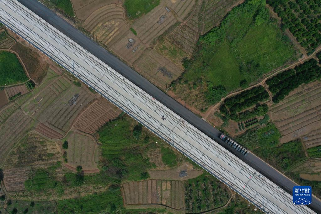 5月30日拍攝的杭衢鐵路已完成無砟軌道施工的路段(無人機照片)。