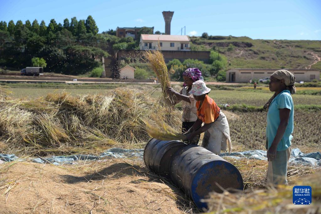 5月12日,在馬達加斯加首都塔那那利佛附近的馬義奇鎮,農民在中國國家雜交水稻工程技術研究中心非洲分中心的試驗田里收獲水稻。