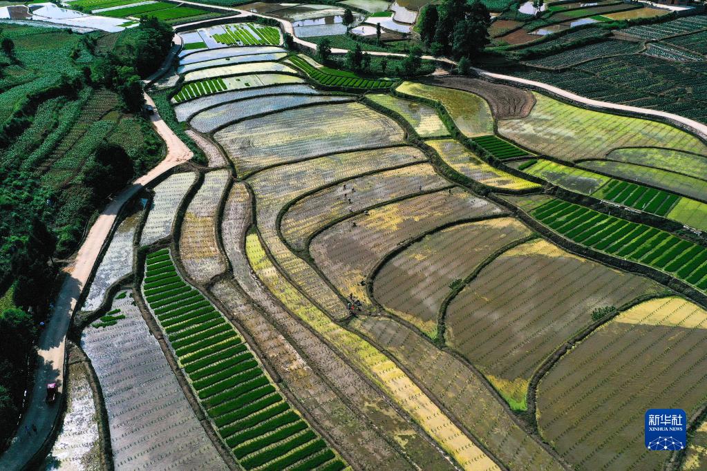5月29日,村民在岑鞏縣水尾鎮新場村的雜交水稻制種基地移栽制種水稻秧苗(無人機照片)。